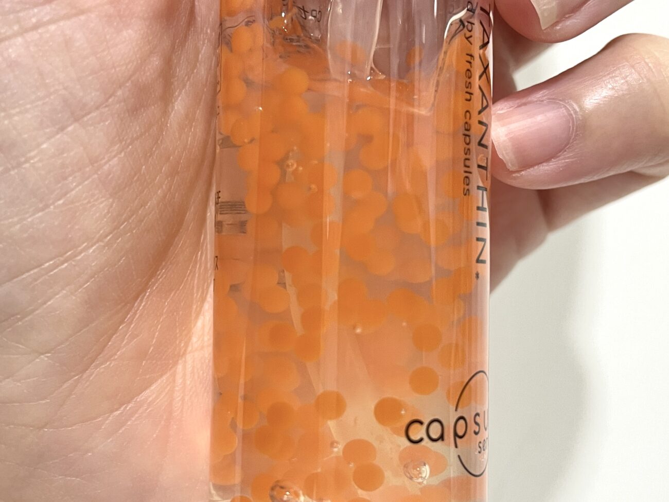 橘瓶裡的「小膠囊」放大來看很像一顆顆鮭魚卵,超級可愛!質地本身具有稠度,搖晃時不會流動,更不會在瓶中破掉,直到用完都會呈現這個療癒的樣子。