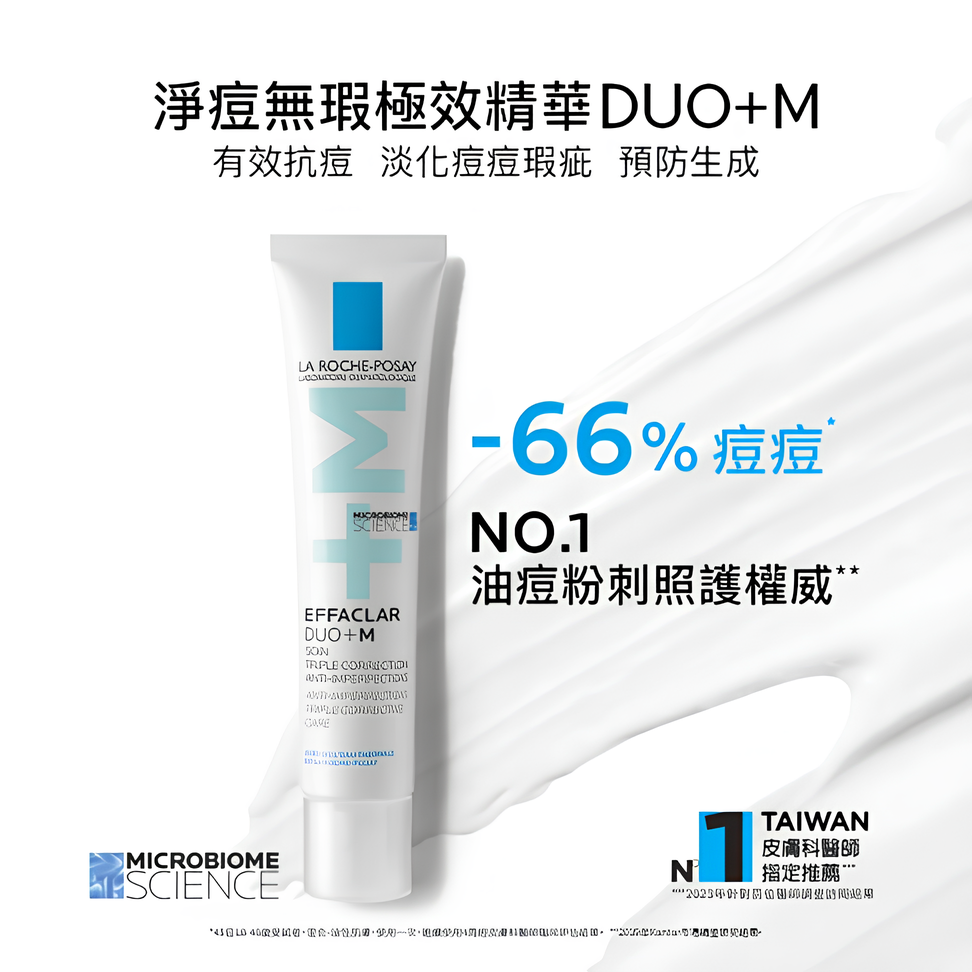淨痘無瑕極效精華DUO+M主打「速淨痘、不復發、不留痘疤」,結合專利抗痘益生精粹PHYLOBIOMA與LHA(辛醯水楊酸),在不需高濃度的情況下溫和代謝老廢角質、深入調理粉刺與痘痘;同時搭配菸鹼醯 與PROCERAD™專利神經醯胺衍生物,有效幫助舒緩泛紅、修護屏障並改善痘疤暗沉。