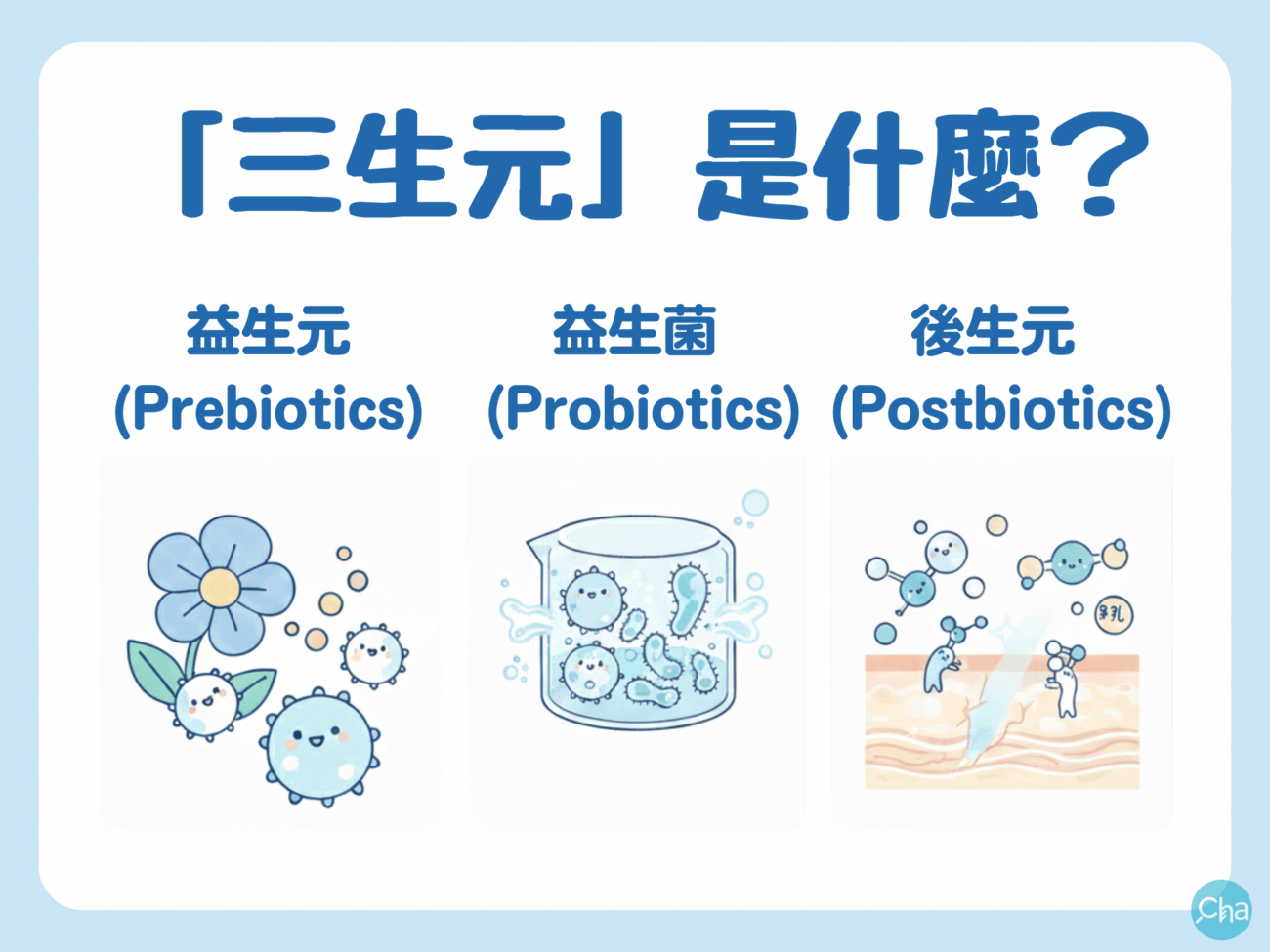 就像腸道、過敏體質需要不同益生菌保養,肌膚微生態也有下列三種「三生元」,能更精準的補足菌叢所需的益生菌: