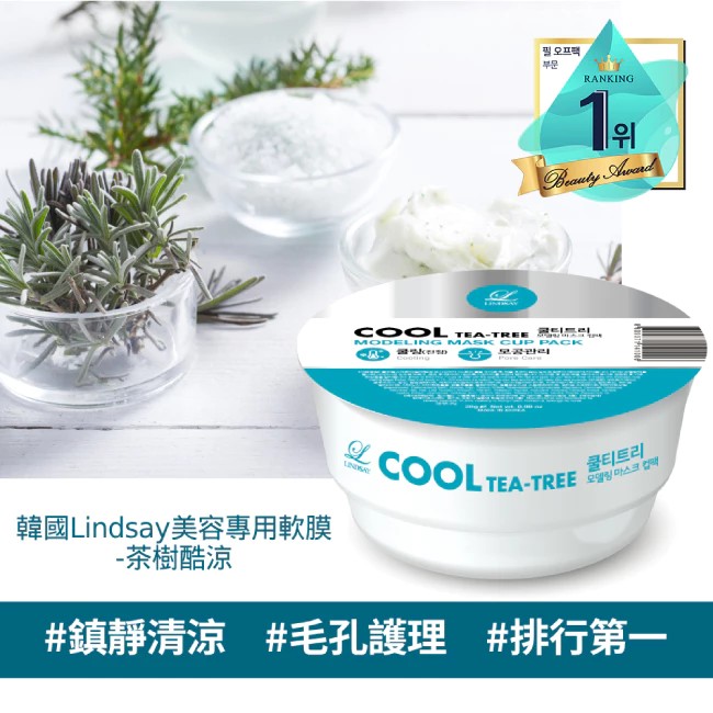 號稱韓國美容院線等級專用的軟膜「Lindsay」,配合不同美容成分推出多款軟膜,當中茶樹為唯一的鎮靜涼感款,特別強化了「降溫」與「淨化」功能,在敷臉的15-20分鐘,能快速帶走肌膚熱感,平衡過剩的皮脂分泌,並幫助其他配方成分深入肌底、放大功效。