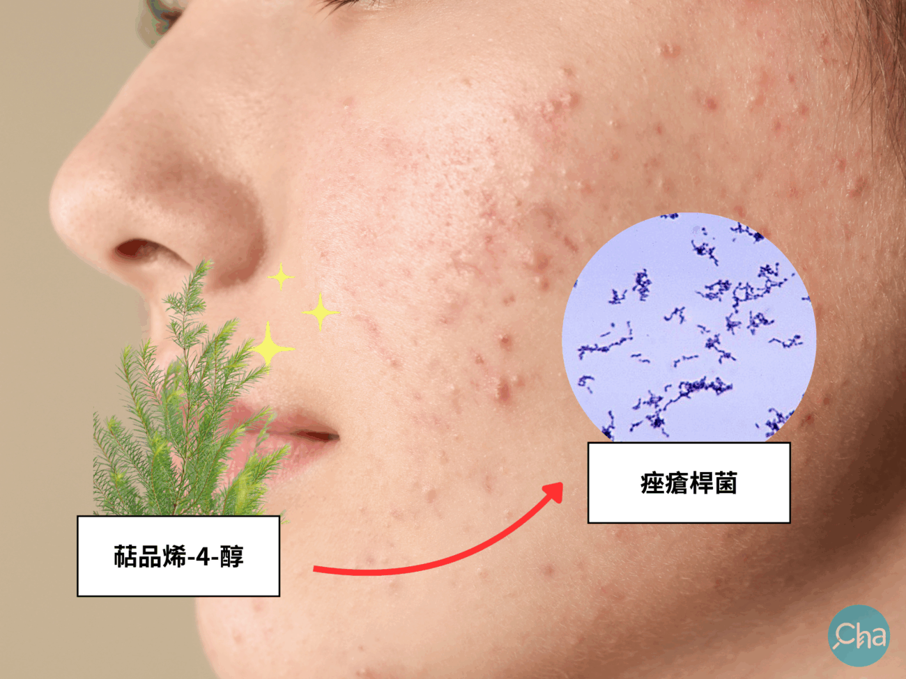 茶樹中最核心的活性成分「萜品-4-醇(Terpinen-4-ol)」,在多項研究中被證實能有效抑制痤瘡桿菌生長,藉由天然抑菌能力,從源頭減少發炎介質的釋放,進而改善皮膚紅腫、熱痛等不適感,讓肌膚逐步平靜下來。