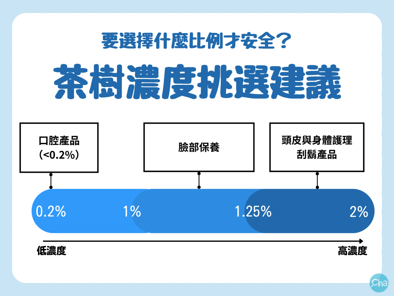 配方比例是使用保養品時,確認安全與效果平衡的關鍵。如同其他保養成分般茶樹在不同用途的產品中,也會遵循下列不同用途的「最高濃度比例」,以避免過度刺激肌膚屏障: