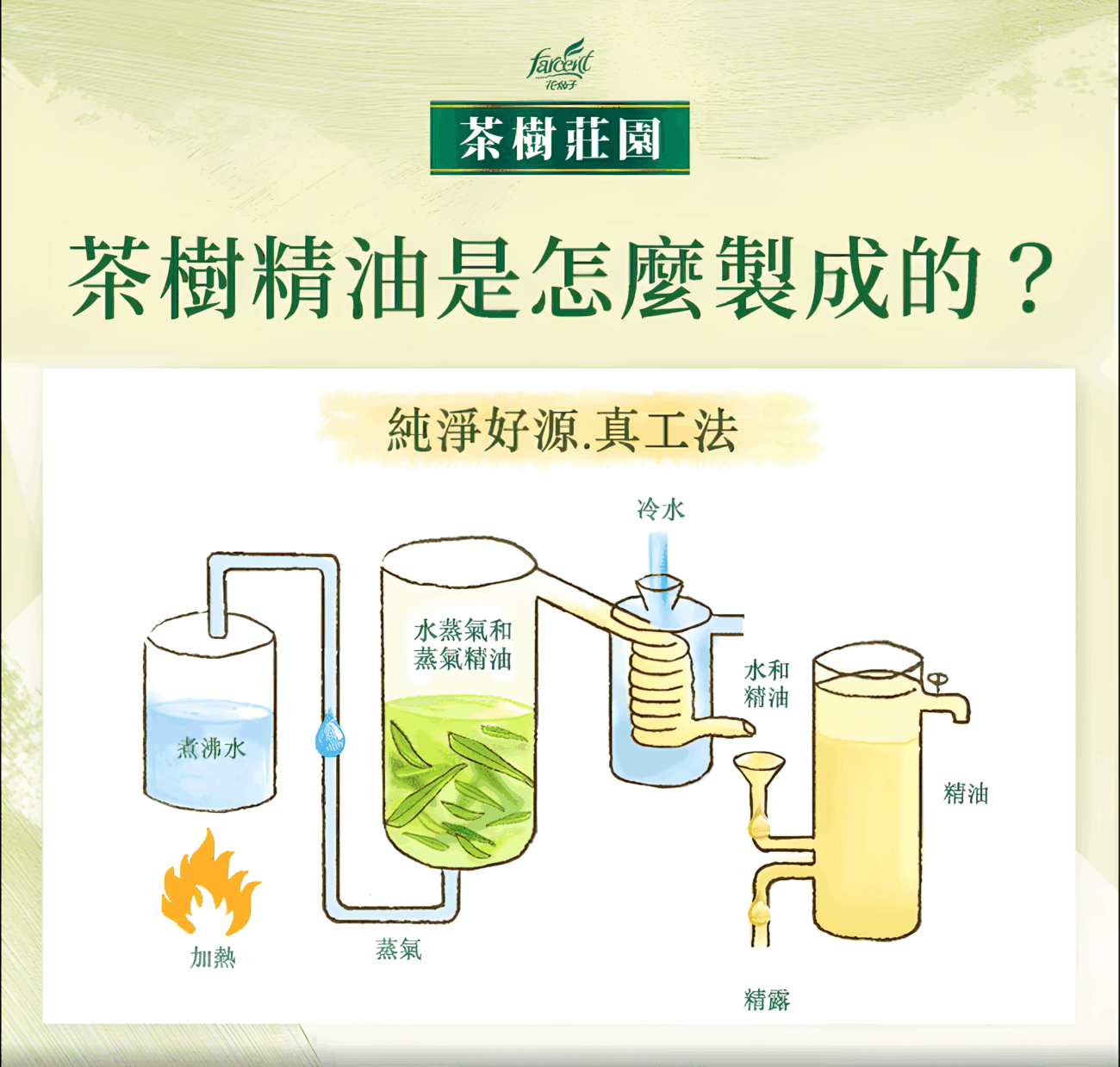 澳洲茶樹葉片採收後,經過蒸餾萃取提煉出茶樹精油,有些愛好者會直接拿來做按摩、驅蟲或居家清潔;而保養方面,直接使用高濃度純精油可能對肌膚具刺激性,直接抹容易造成發炎或脫皮,通常會稀釋後使用,或由品牌研發者依照安全比例調配進產品中,確保發揮修復力的同時,也能維持安全和穩定性。