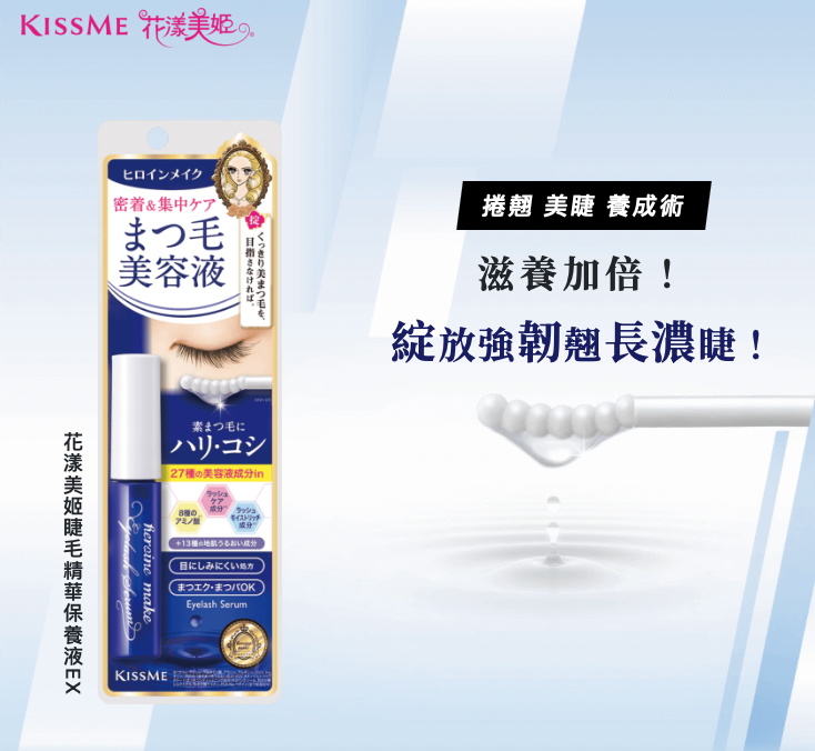 來自日本知名睫毛專家KISSME的「花漾美姬睫毛精華保養液 EX」,進階版配方大幅升級!高達 27 種美容液成分中包含 14 種針對細短睫毛的滋養成分,以及 13 種呵護眼瞼肌膚的潤澤成分。主打全無油配方與速乾特性,不僅能有效縮短保養後等待時間,對於有接睫毛習慣的人來說更是友善首選,好用到連眉毛也能一併照顧到。