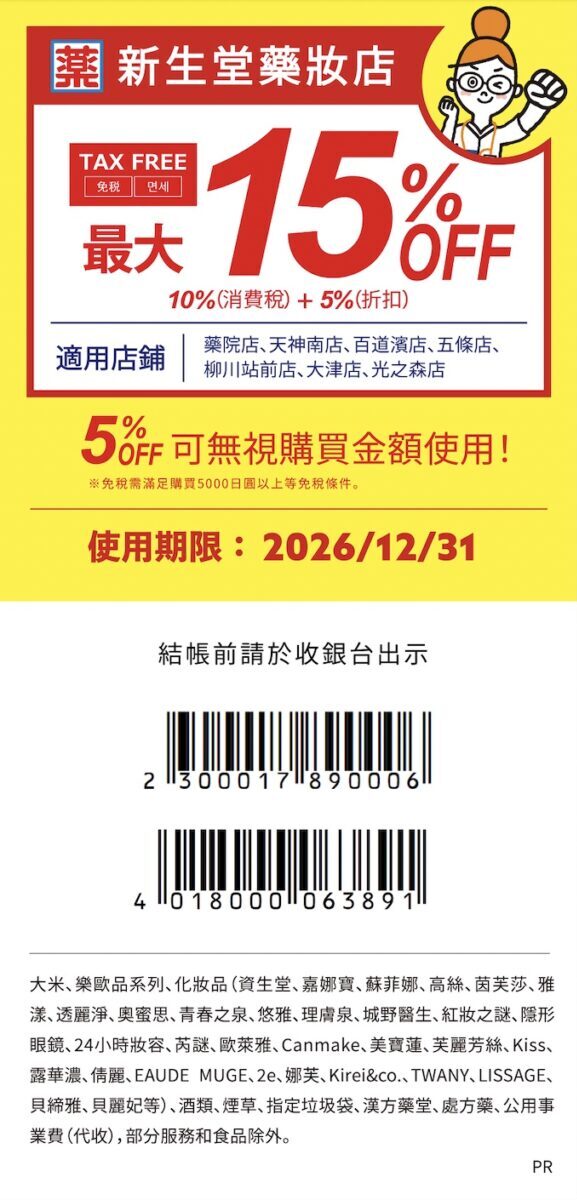 下載2026年最新「新生堂藥妝優惠券」享無門檻85折!15%OFF折扣攻略