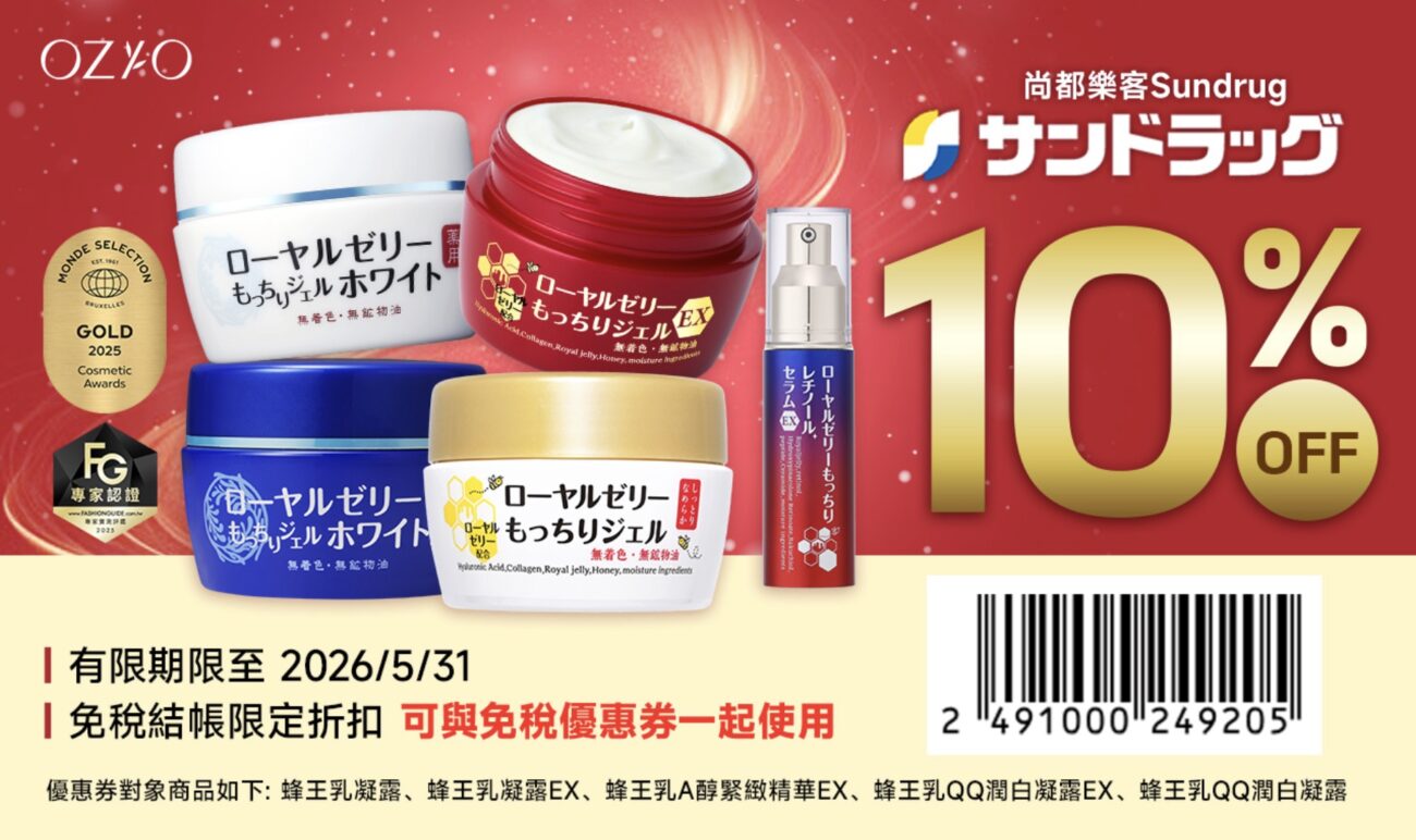 在2026/05/31前,在SUNDRUG門市購買OZIO 蜂王乳凝霜、蜂王乳凝霜EX、蜂王乳A醇緊緻精華EX、蜂王乳QQ潤白凝露EX、蜂王乳QQ潤白凝露等商品,便可既享優惠券折扣,再額外加碼上述商品10%OFF,如此好康過了期限就沒囉!